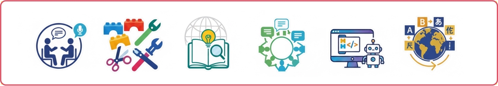 英語でのスピーチやプレゼンテーション、ディスカッション、質疑応答を通して、内容の論理性と言語運用を総合的に確かめる形式です。単に英語が話せるかではなく、相手の問いを理解し、自分の主張を再構成して伝える対話力が重視されます。資料を英語で読み取り、要点を整理してわかりやすく再構成できるかも大切なポイントです。②の探究テーマ型や⑤のワークショップ型の要素を取り入れ、英語を使って社会的な課題や身近なテーマについて考察・協働・発表するケースも見られます。