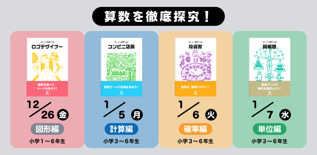 今回は、12月のロゴデザイナー(図形編)から始まり1月の貿易商(単位編)で終わる、計4つの講座をご用意しました。