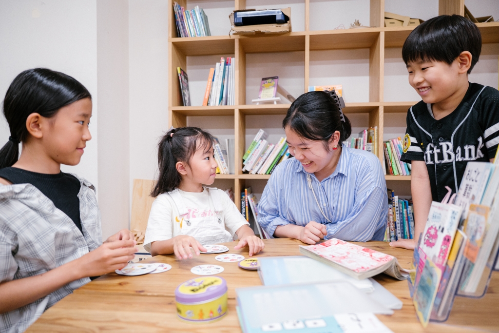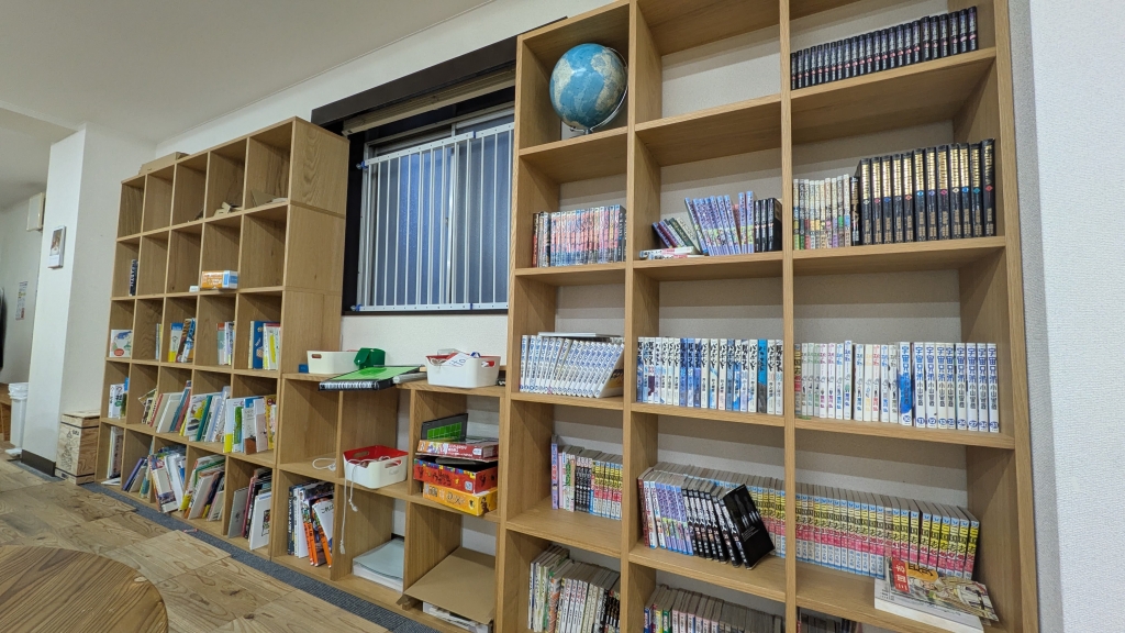 みんなで囲める丸いテーブルに、壁一面の本棚。図鑑、学習マンガ、絵本がずらりと並び、棚には楽しそうなボードゲームも山積み!