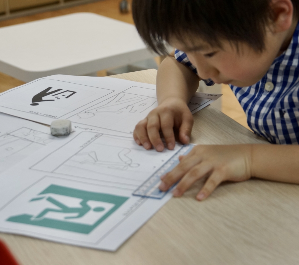 ここで大事なのは、答えが一つではないこと。図形を使って「新しいマークを作ろう」というワークでは、どんなマークにするかは子どもによってまったく違います。試行錯誤しながら自由に表現できて、その結果として、図形の特徴を学ぶことで表現の幅が広がっていきます。