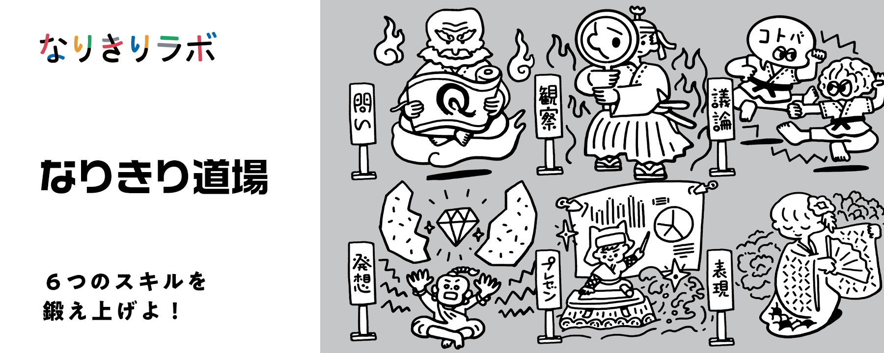 「問い」「観察」「観察」「議論」「プレゼン」「表現」これら6つのスキルを鍛えるためには、訓練を積み重ねることが不可欠です。なりきり道場で、技を覚え、鍛え上げ、日常や将来にいかしましょう。