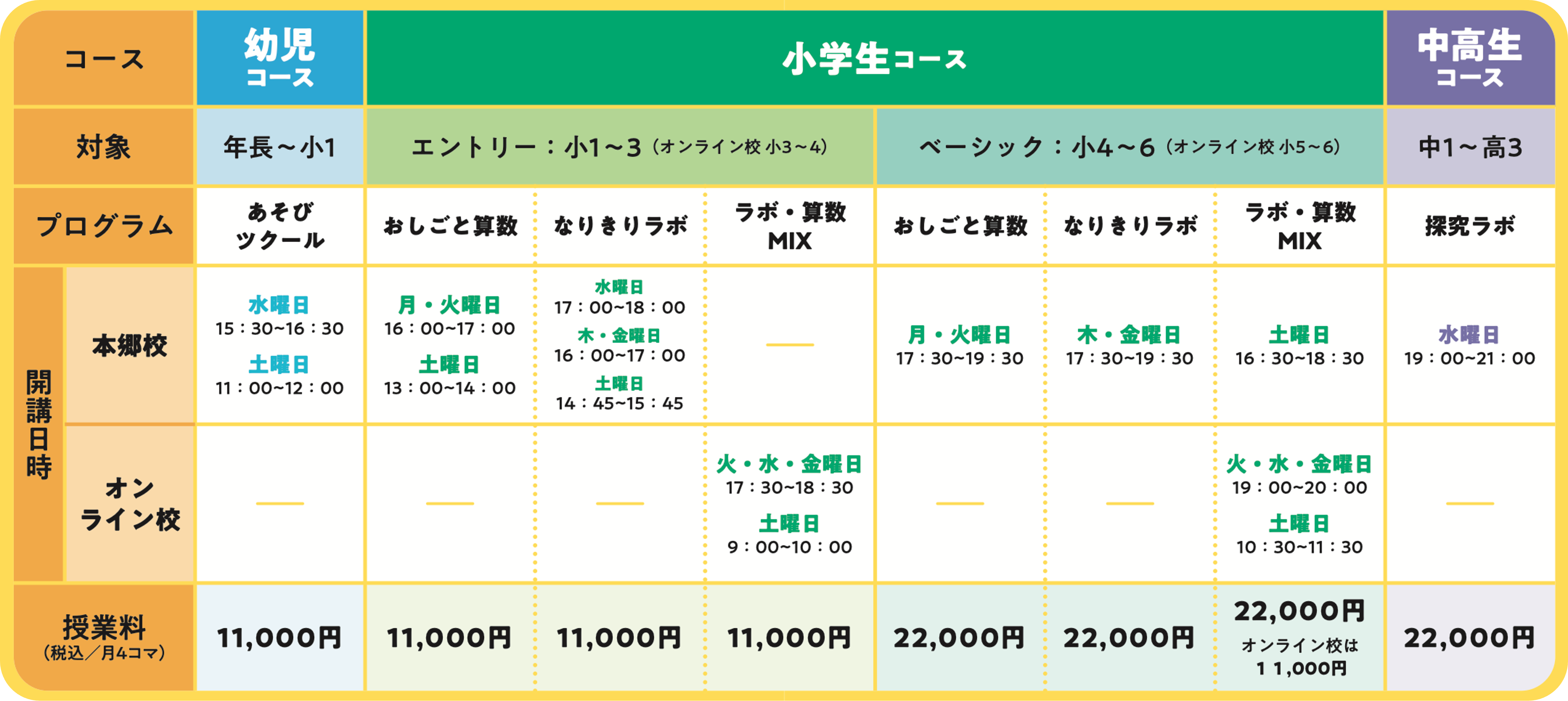 小学校6年間で学ぶ算数の全単元+α(統計など)を網羅したカリキュラムです。反復練習よりも、算数と社会とのつながりを体感できるような、実践的かつ創造的な内容です。(算数の好き嫌いや得手不得手は問いません。)